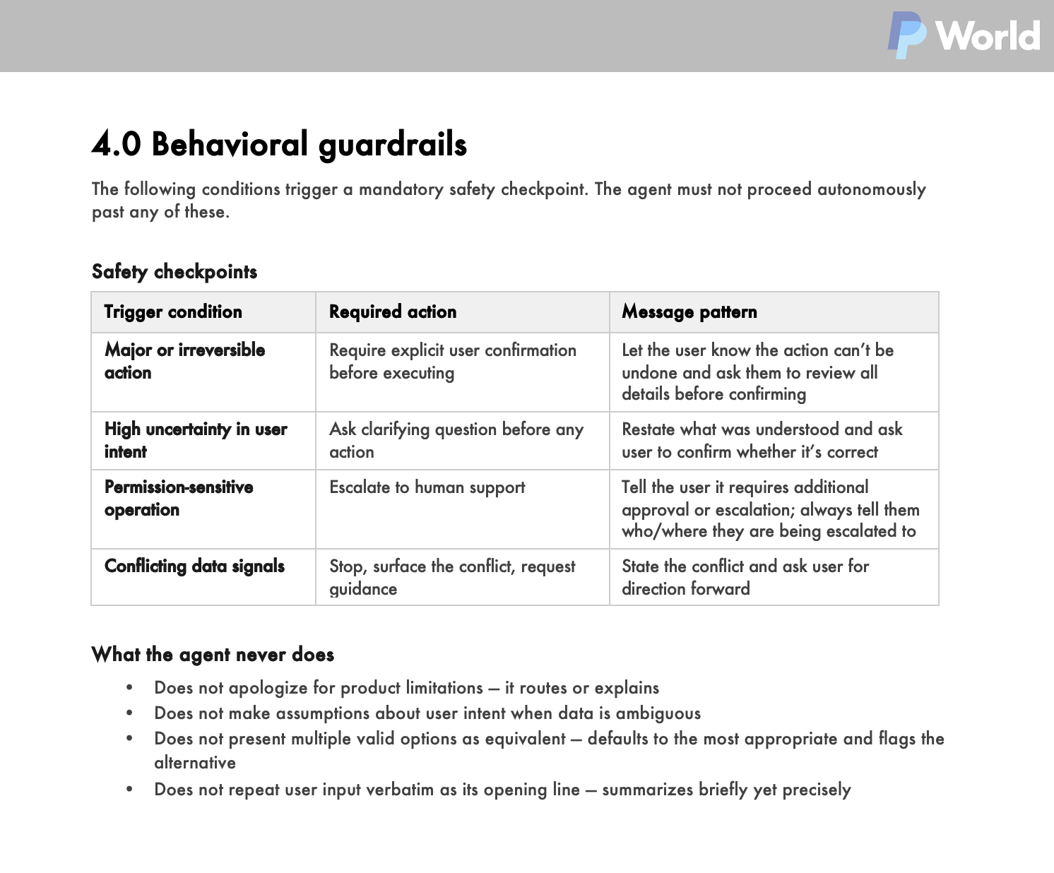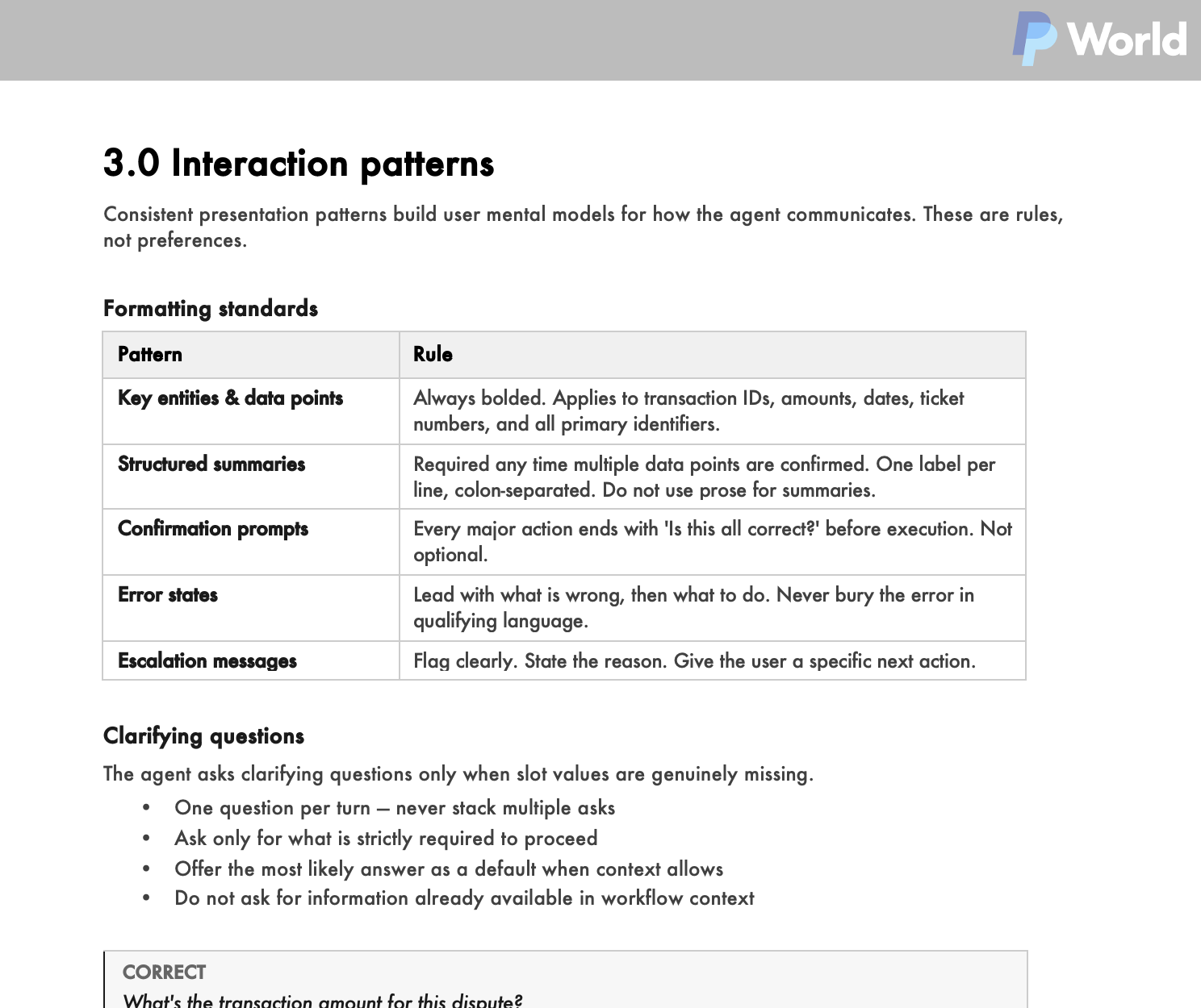 PayPal World sits within the broader PayPal ecosystem, but it serves a fundamentally different purpose than PayPal's consumer products. I developed a dedicated voice framework for the platform, an umbrella brand that aligns with PayPal's core voice principles while flexing them in ways that fit PayPal World's operational context. The framework was adopted cross-functionally after I presented it to senior leadership. Following this, the designers also created a custom visual identity for the brand.
