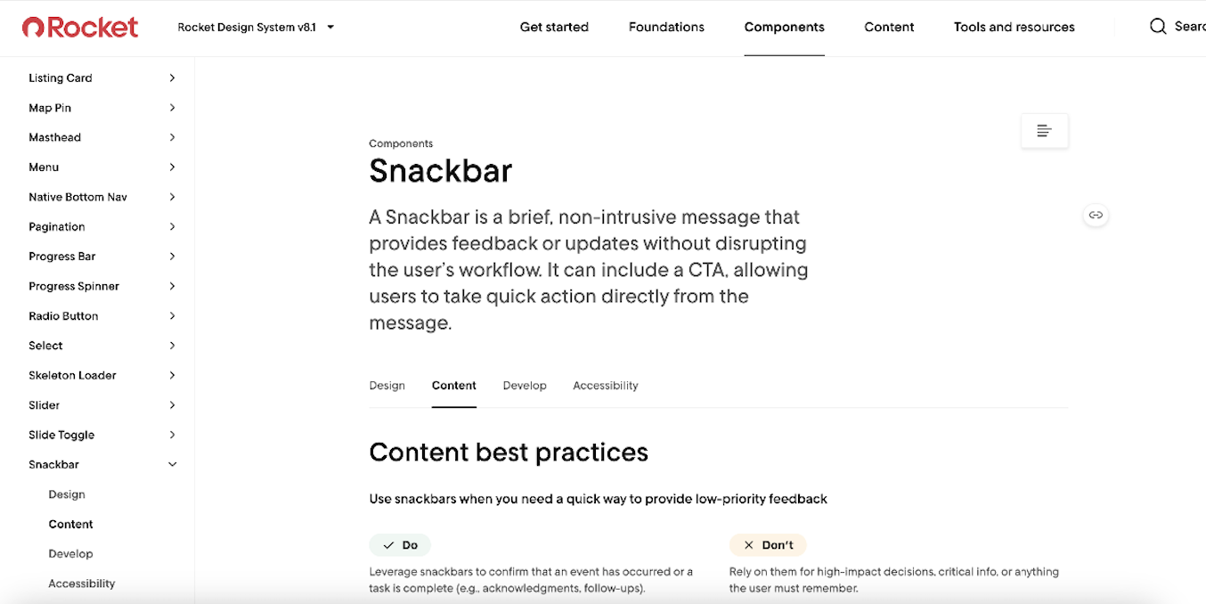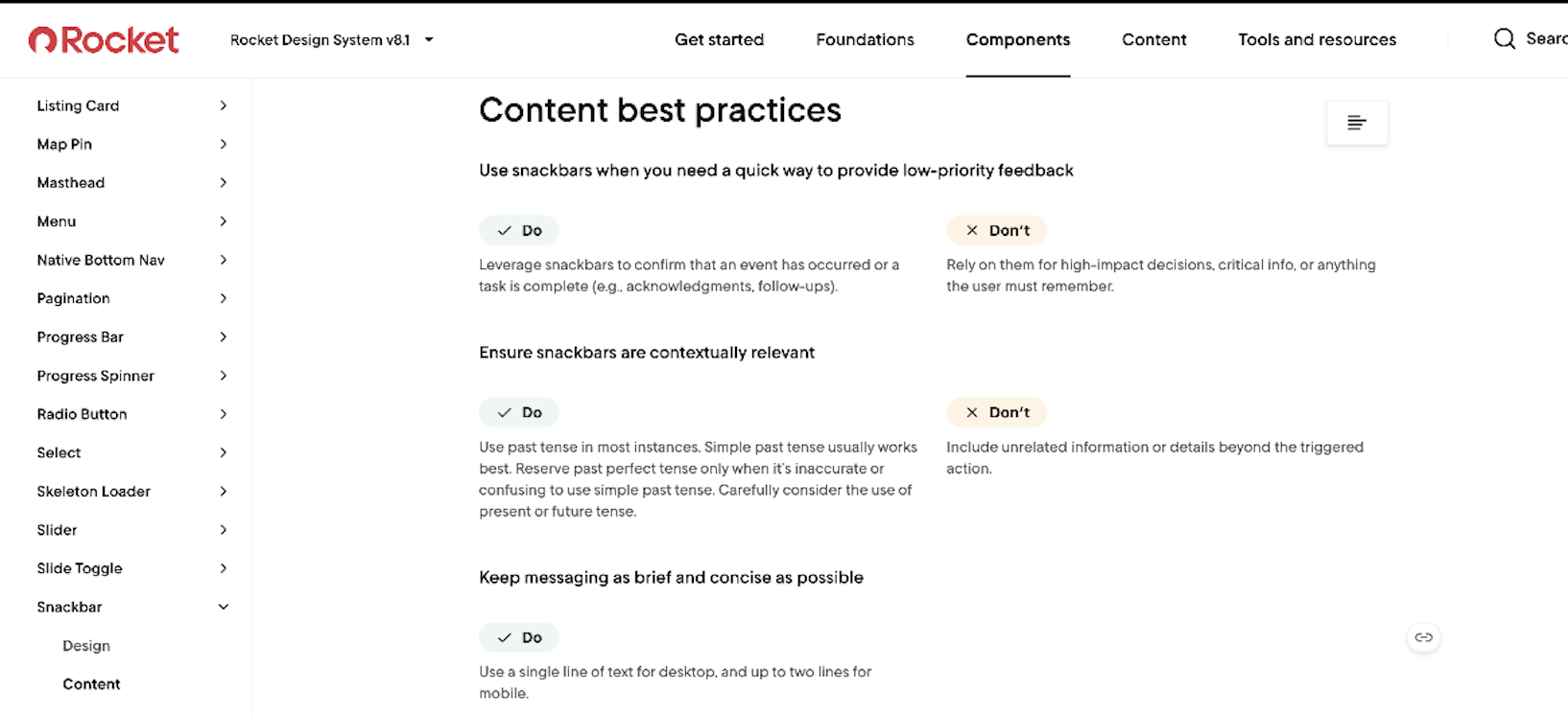 I was part of the core team building Rocket Mortgage's first company-wide content design system, contributing to a foundation that would create consistency across products and teams at scale. In that work, I also served as the team's accessibility consultant. I earned my UX accessibility certification in 2025, after six months of studying outside of work hours, and I brought that expertise directly into the system.
