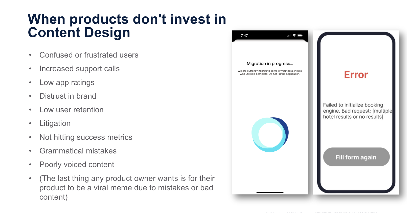 Through GoLocal, I fell in love with UX content design and content strategy. I quickly became the sole and founding content designer for supply chain and fulfillment products. I then began evangelizing my work as a discipline across my organization of over 10,000 people. I didn't wait for teams to come to me – I took content design/content strategy on a roadshow, pitching the value directly to stakeholders and product teams across the organization. I proved the value of the discipline further through a regular series of leadership deep dives, making the case for investment and demonstrating tangible impact. The work spoke for itself, and as demand grew, I began hiring and building what would eventually become a team of six, spanning the entire U.S. Omni & Platforms Tech org.